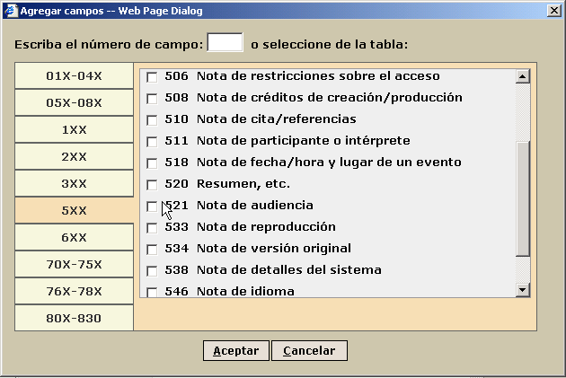 Menú de selección de campos